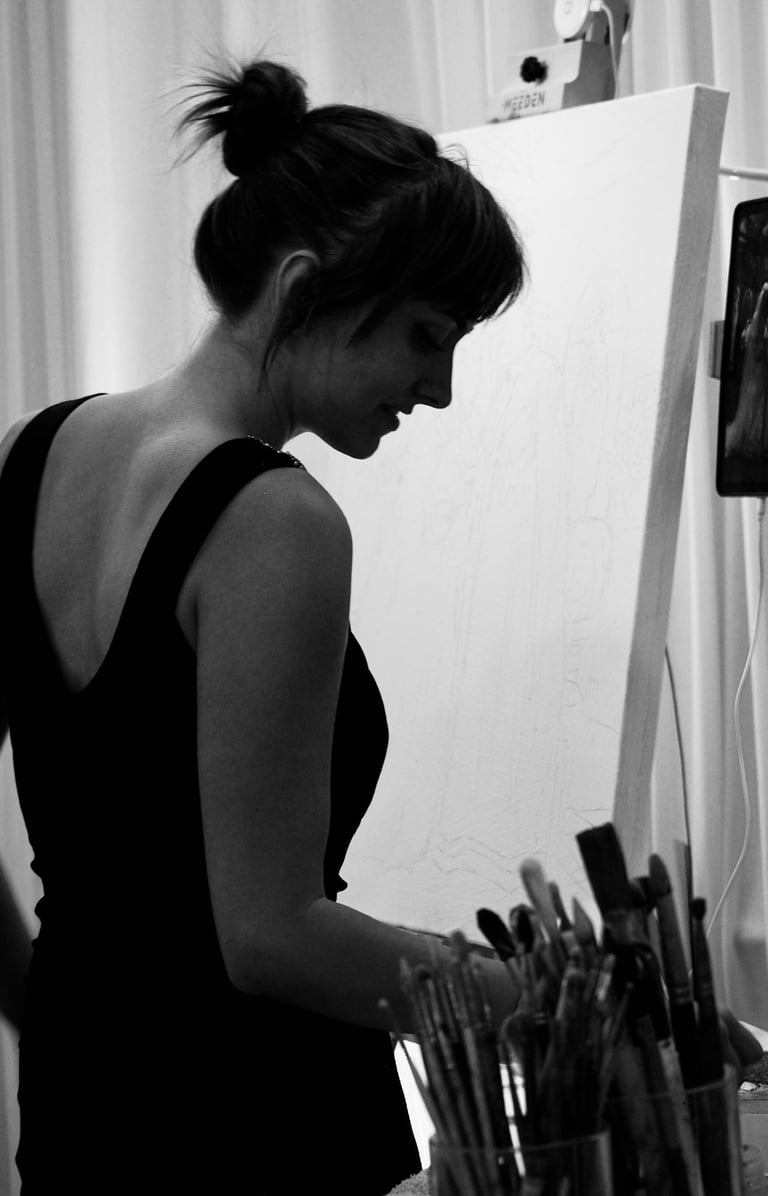 Specializing in the craft of oil painting, she captures the elegance of classical artistry through a contemporary lens. Her goal is to elevate live painting to new levels of beauty, aesthetic and mastery.